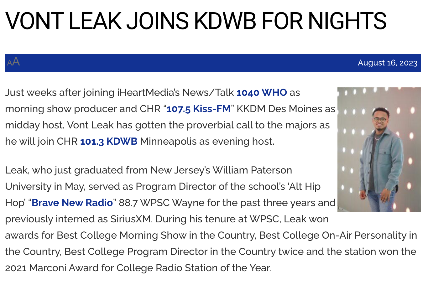 Within weeks of graduating with his B.A. at William Paterson University of New Jersey, Vont’s tireless passion to his craft paid off when he got hired by iHeartRadio in Des Moines, Iowa. Nearly immediately after moving there, he got what RadioInsight calls “a proverbial call to the majors” and the promotion of a lifetime at a major market radio station.